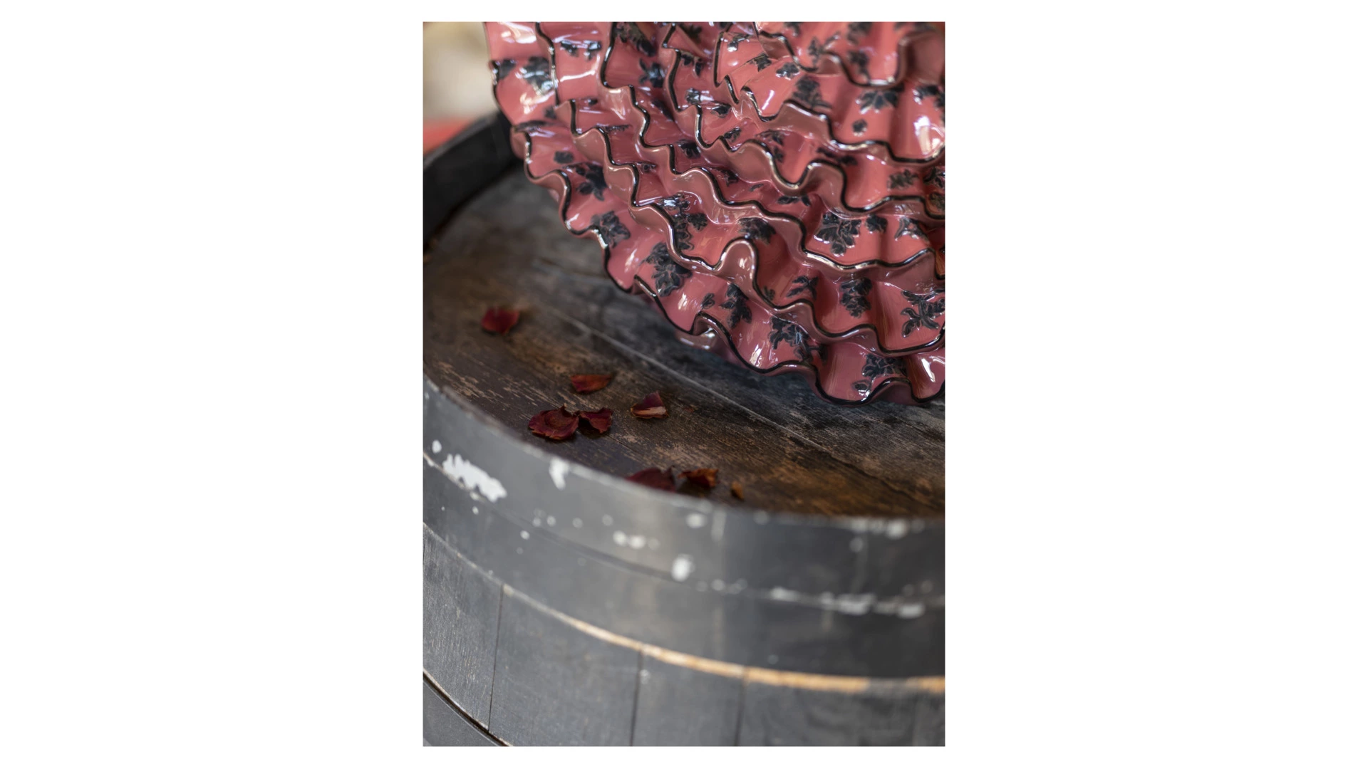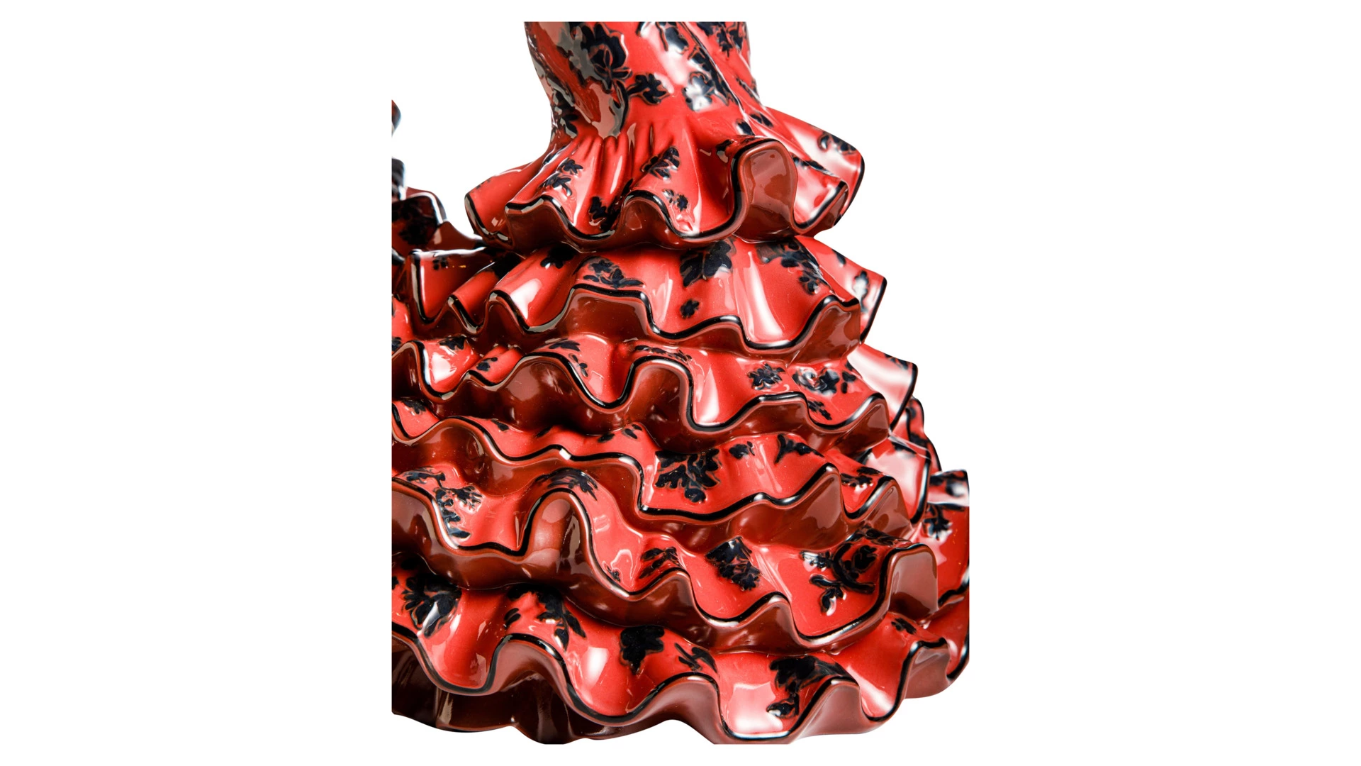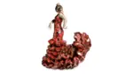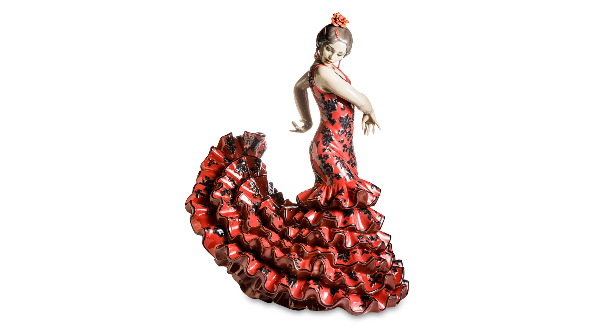 Жаркие ритмы гитары и кастаньет нашли своё отражение в статуэтках испанского бренда Lladro. Фигурка «Искусство фламенко» изображает девушку в традиционном платье bata de cola. Танцовщица изящно опустила голову, согнула локти и запястья, передавая нежность и отчаяние, которые приносит любовь. Чёрно-красный цвет наряда говорит о страсти, горящей как огонь. Причёску украшает алая роза с хорошо проработанными лепестками. Фарфоровые воланы и оборки юбки выглядят совсем как настоящие. Кажется, что сейчас женщина взмахнёт руками, взметнувшийся вверх подол упадёт, и танец продолжится с новой силой.