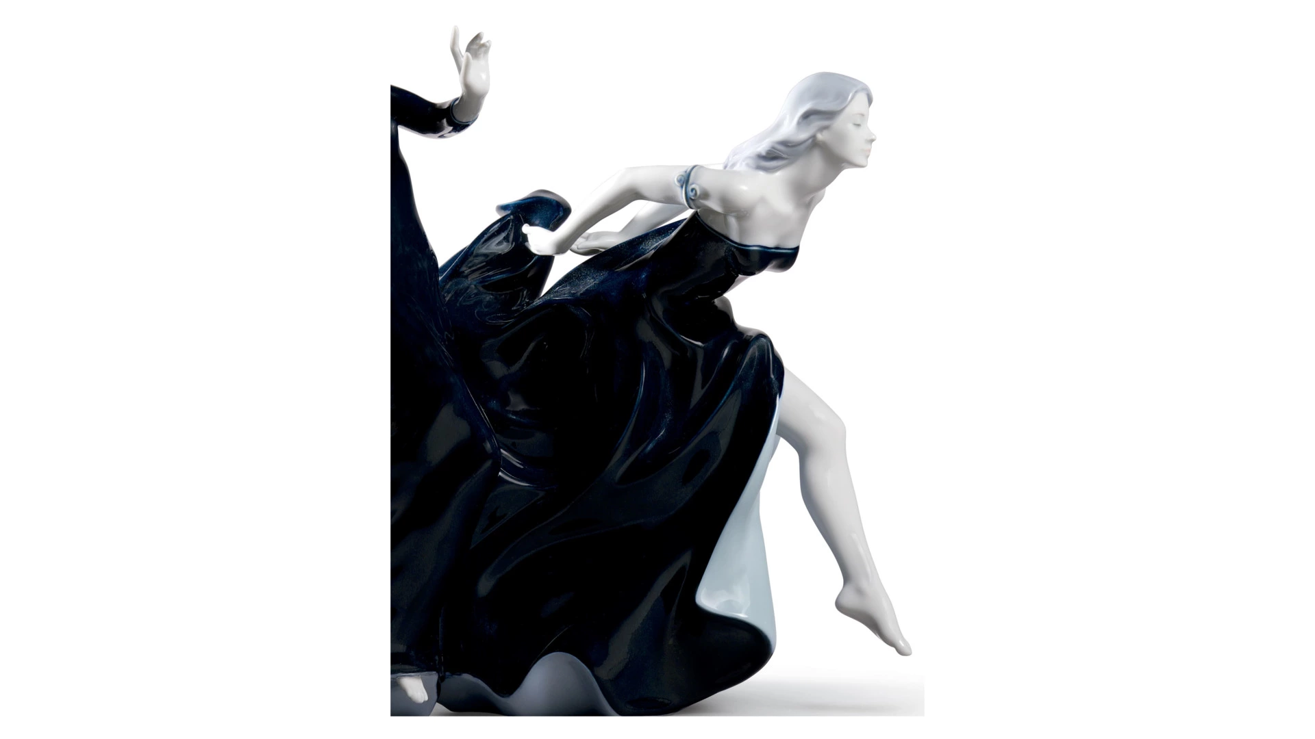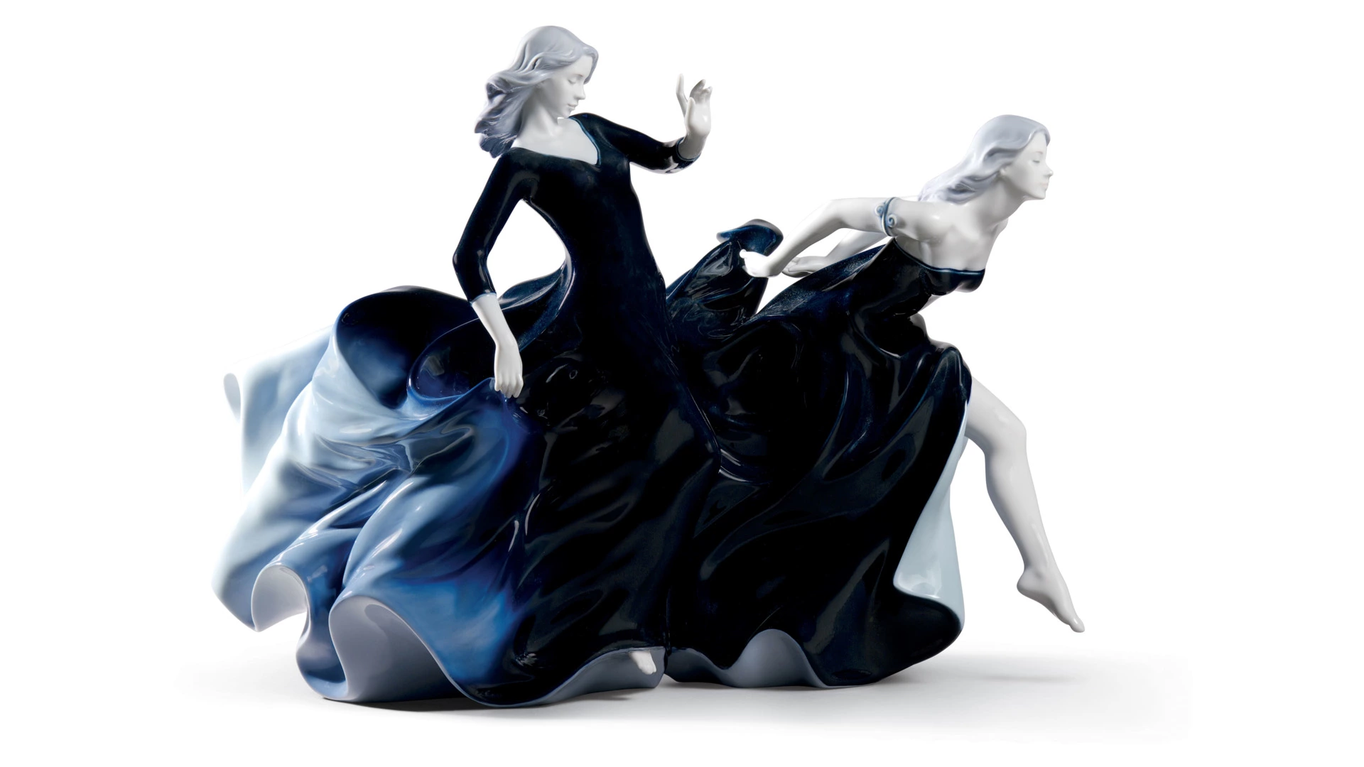 Фигурка «Приближение ночи» бренда Lladro – шикарное украшение интерьера и ценное дополнение коллекции фарфоровых статуэток. Скульптурная композиция изображает двух застывших в танце девушек. Длинные чёрно-синие платья символизируют уходящий день и наступающую темноту. За счёт монообжига готовое произведение «Льядро» приобретает прозрачную глянцевую поверхность, как будто излучает изнутри тёплый свет. Благодаря универсальной эстетике изделие испанского производителя прекрасно вписывается в классические и минималистичные пространства.