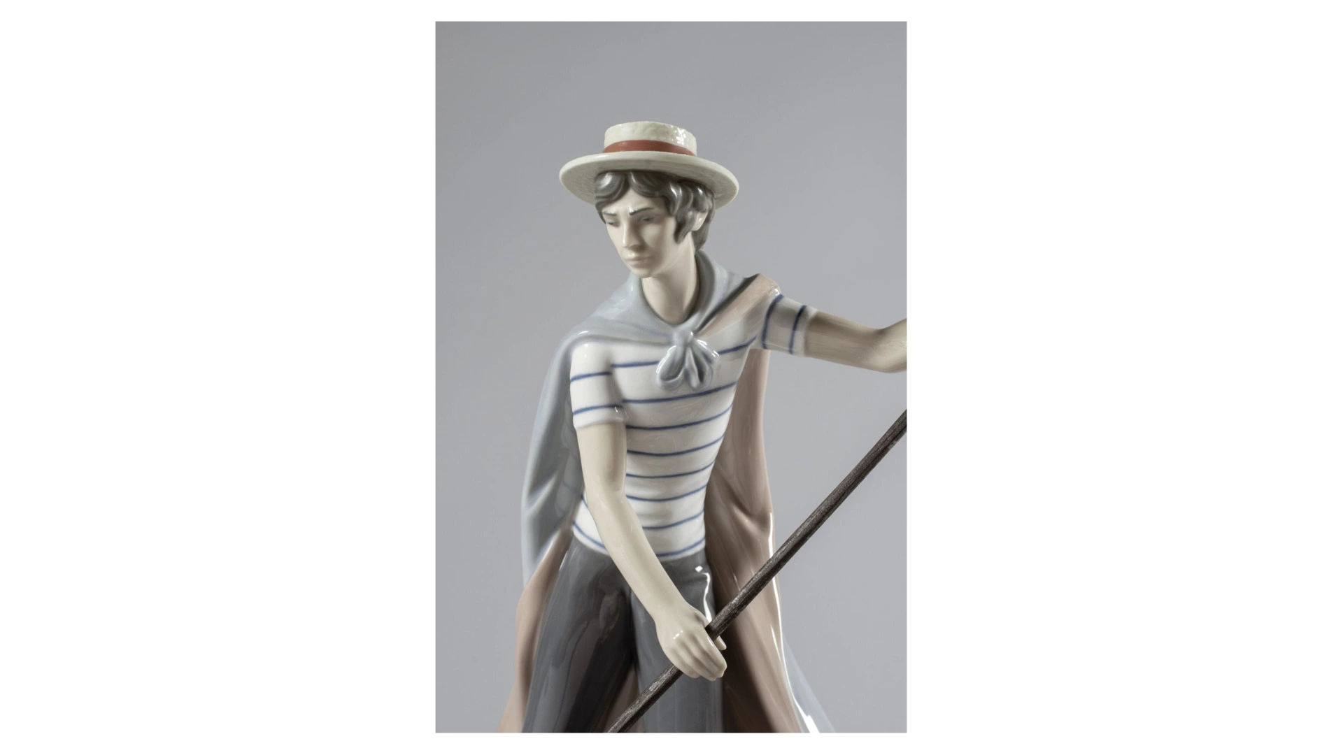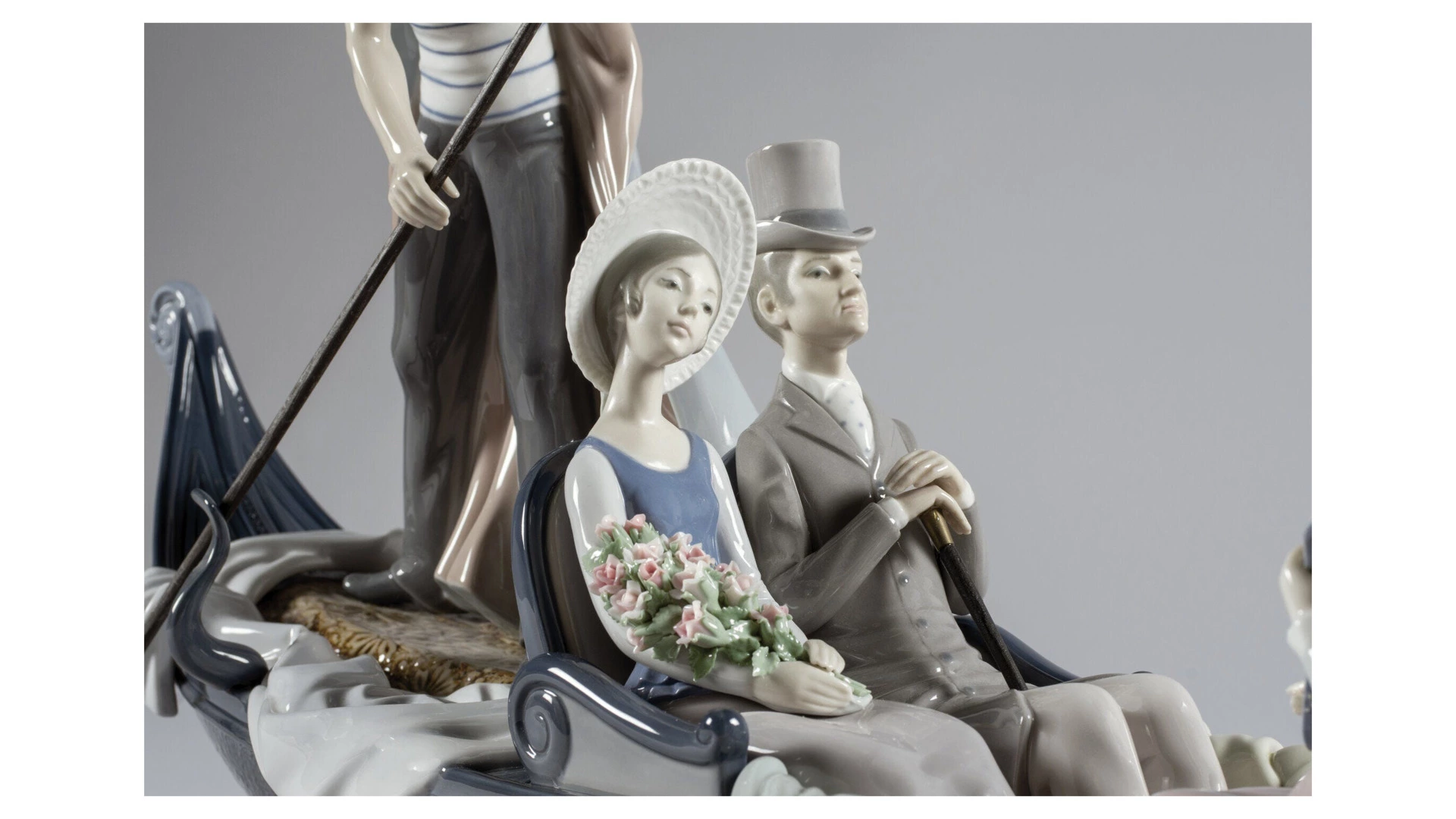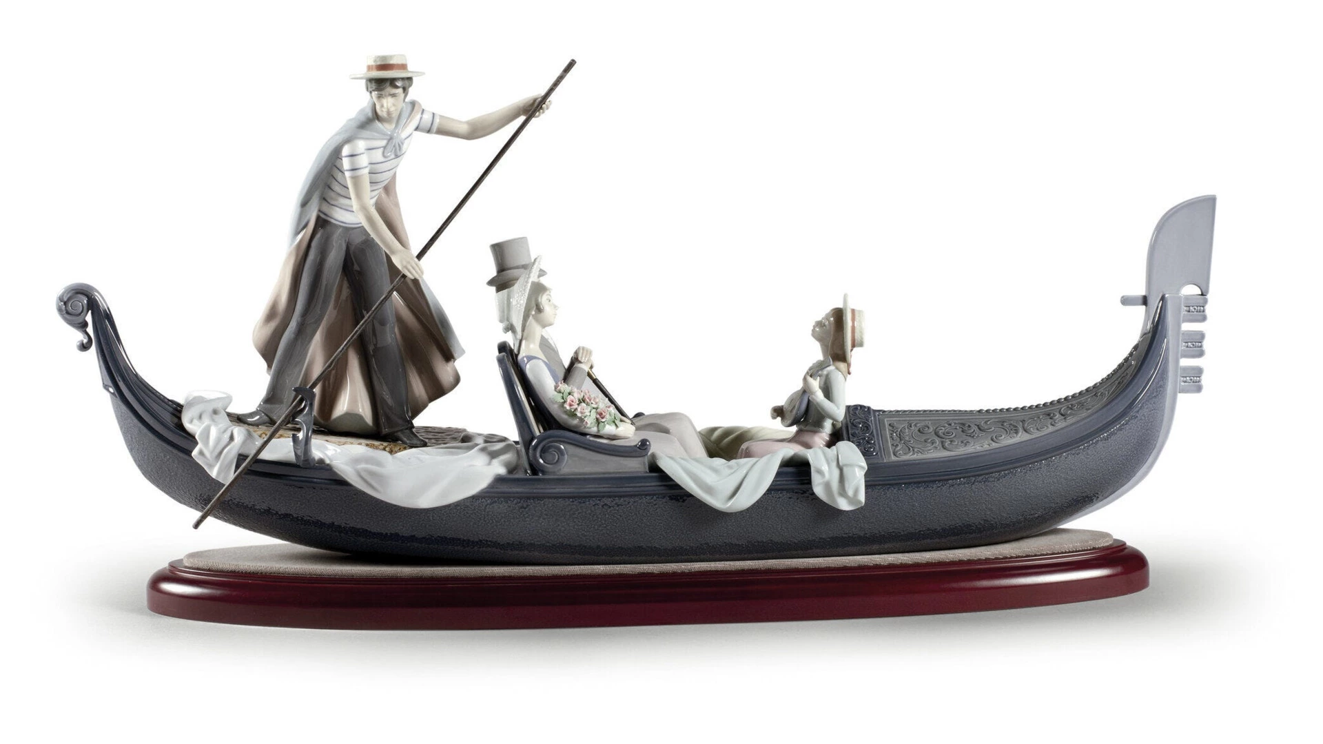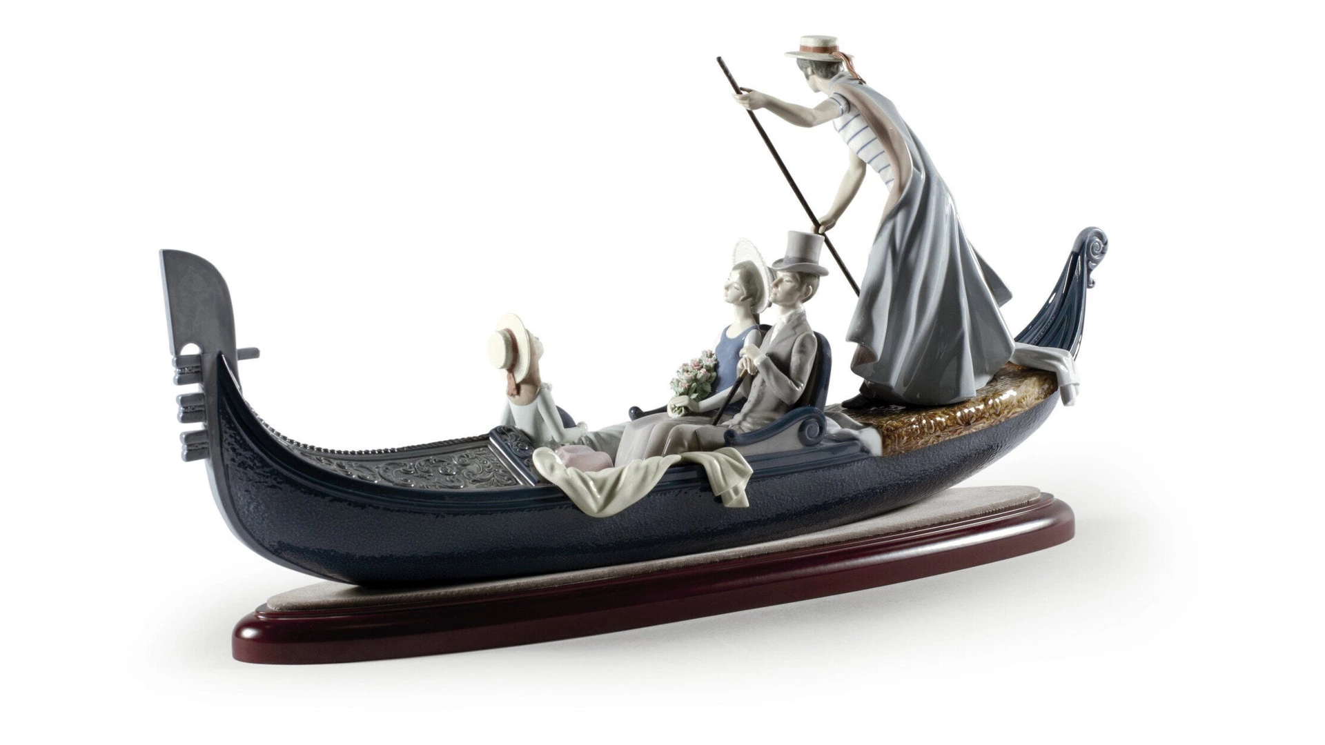 Статуэтка «В гондоле» от бренда Lladro изображает молодую пару, наслаждающуюся водной прогулкой по венецианским каналам. Мастера с впечатляющей точностью воплотили не только фигурки персонажей в динамике, но и одежду 19 века. Исключительная проработка мельчайших деталей, включая лепестки цветочного букета и орнаменты на гондоле, восхищает высоким уровнем профессионализма.